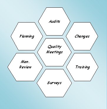 Planning Analysis of Data Quality System Statistics Setting of Goals and Objectives Audits Internal / External Audits Quality Meetings / Management Review Quality Meetings & Management Review Quality Management System Customer Complaints Changes Change Request Control of Documents (Q.M.S. Changes) Usage of Quality System Improvement Request Training Quality Awareness Training Surveys Internal Surveys External Surveys |